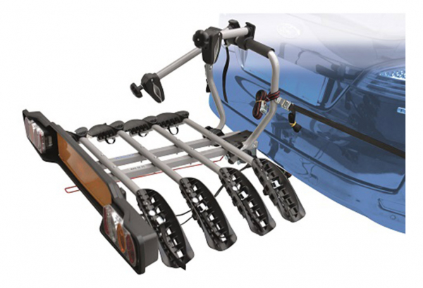 El portabicicletas de enganche Peruzzo Siena 4 es rápido y fácil de montar y desmontar. Puntas para el acceso al maletero. Doblemente seguro con la correa de seguridad adicional fijada al cuadro. Completo con barra de luz trasera homologada y enchufe de 13 clavijas.