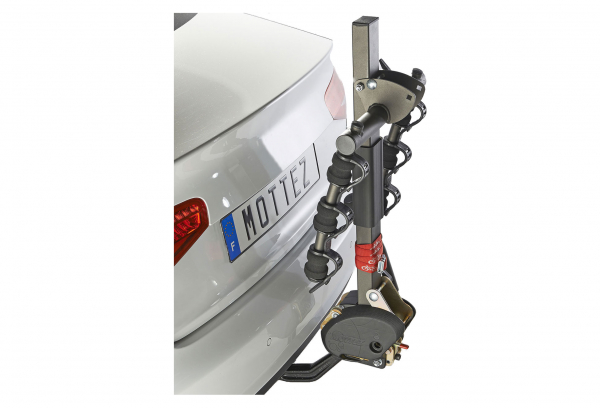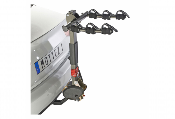El portabicicletasse fija muy rápidamente y sin herramientas.Elmodelo de portabicicletas Mottez puede abatirse para permitir la apertura del maletero en el 80% de los vehículos.En los monovolúmenes, los coches familiares y los vehículos recreativos, el maletero suele ser inaccesible debido al tamaño del portón trasero, que da lugar a un desplazamiento superior a las dimensiones del producto. Lacalidad óptima de tu portabicicletas cumple la norma francesa NF XP R 18-904-4.Acabado en zinc antioxidante y pintura epoxi grafito negra.