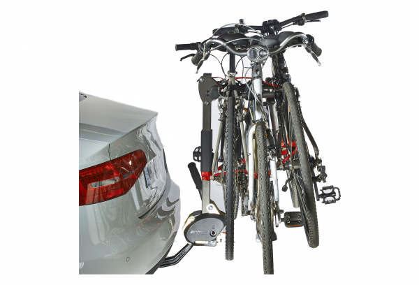 El portabicicletas suspendido se fija a la bola de enganche mediante un sistema de clic fácil.